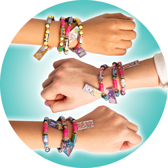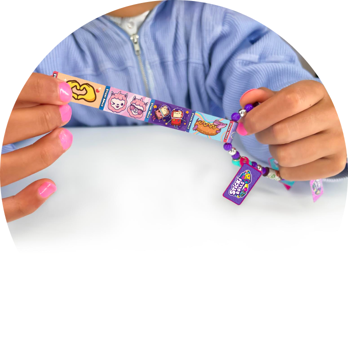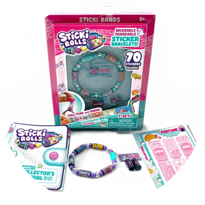 Every Sticki Roll on your bracelet is actually a ROLL of 10 holographic mini stickers that you can pull, tear and share! 70 total stickers in every pack, each with different cute, Kawaii characters! Decorate your stuff, share with friends and build your collection!