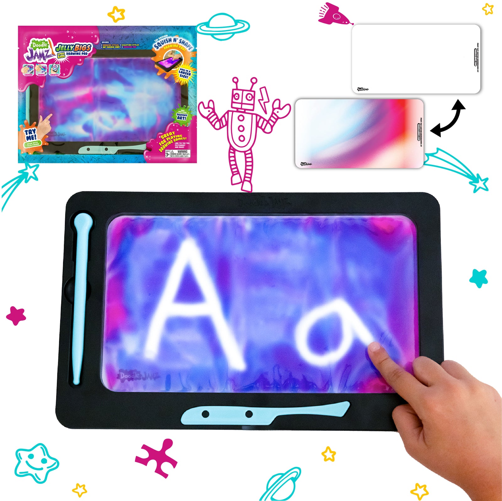 Squish, shape and create art! JellyBoards are filled with two separate layers of colored, non-toxic gel that is vacuum-sealed so drawings stay in place. Draw with fingers or with the stylus to blend the colors together and create one-of-a-kind artistic creations!